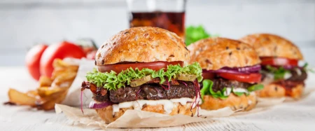 mit 125g Rindfleisch, Salat, Barbequesauce, Tomate, Gewürzgurke, roten Zwiebeln und Bacon